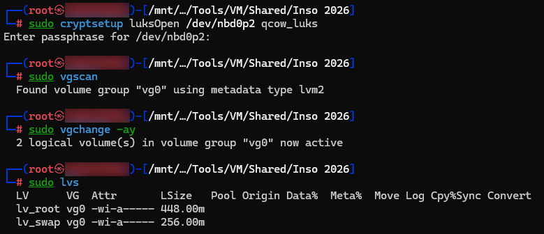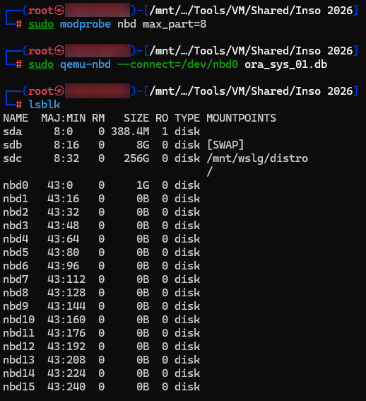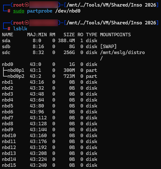 Let’s proceed with offline analysis. Being on a Kali WSL, I cannot see block devices directly. But I can use QEMU’s Network Block Device (qemu-nbd) to “map” the QCOW image as a local disk: