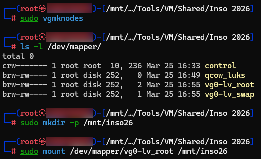 We can now open the LUKS volume using the obfuscated key found in the registry (i.e. M4nn3rsM4k3thM4n), activate the volume groups inside, and mount the relevant volume: