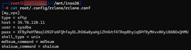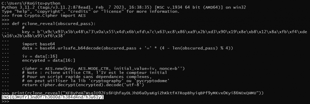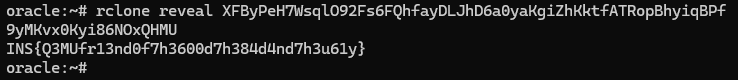 The C2 password is not stored in cleartext, since rclone uses a fixed key and a basic stream algorithm (AES in CTR mode). Thus, it is possible to de-obfuscate this password (and recover our flag) quickly: