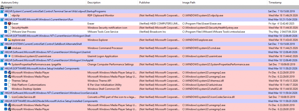 While searching for persistence artifacts wasn’t strictly necessary to solve this challenge, it remains a critical preliminary step in real-life scenarios. At first glance, Autoruns shows nothing unusual: