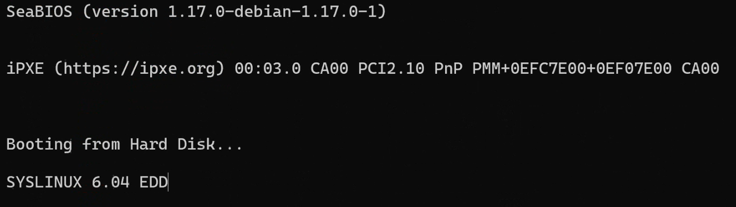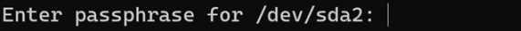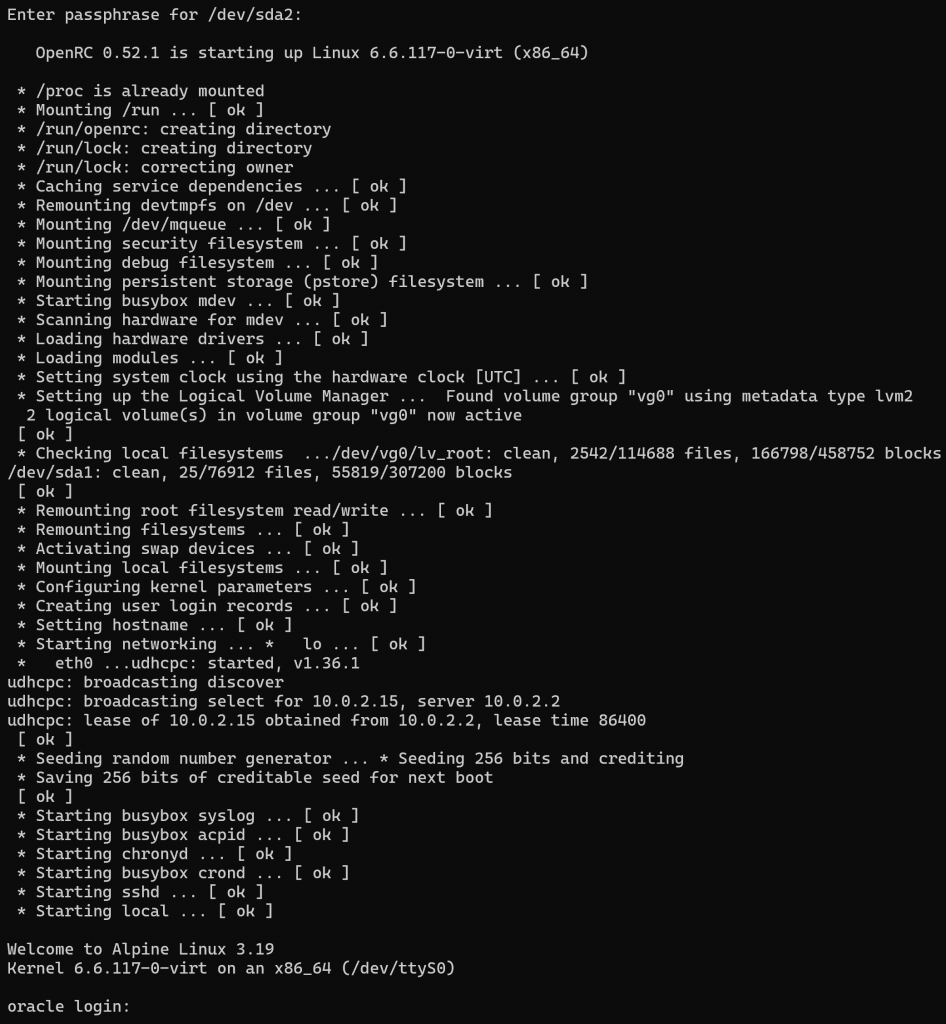 When starting this QCOW image, we see that QEMU launches a lightweight Alpine-based micro-VM, and a password is required to decrypt its partition. Otherwise, we could have simply mounted the disk, which was the case in the recent PayoutsKing attacks: